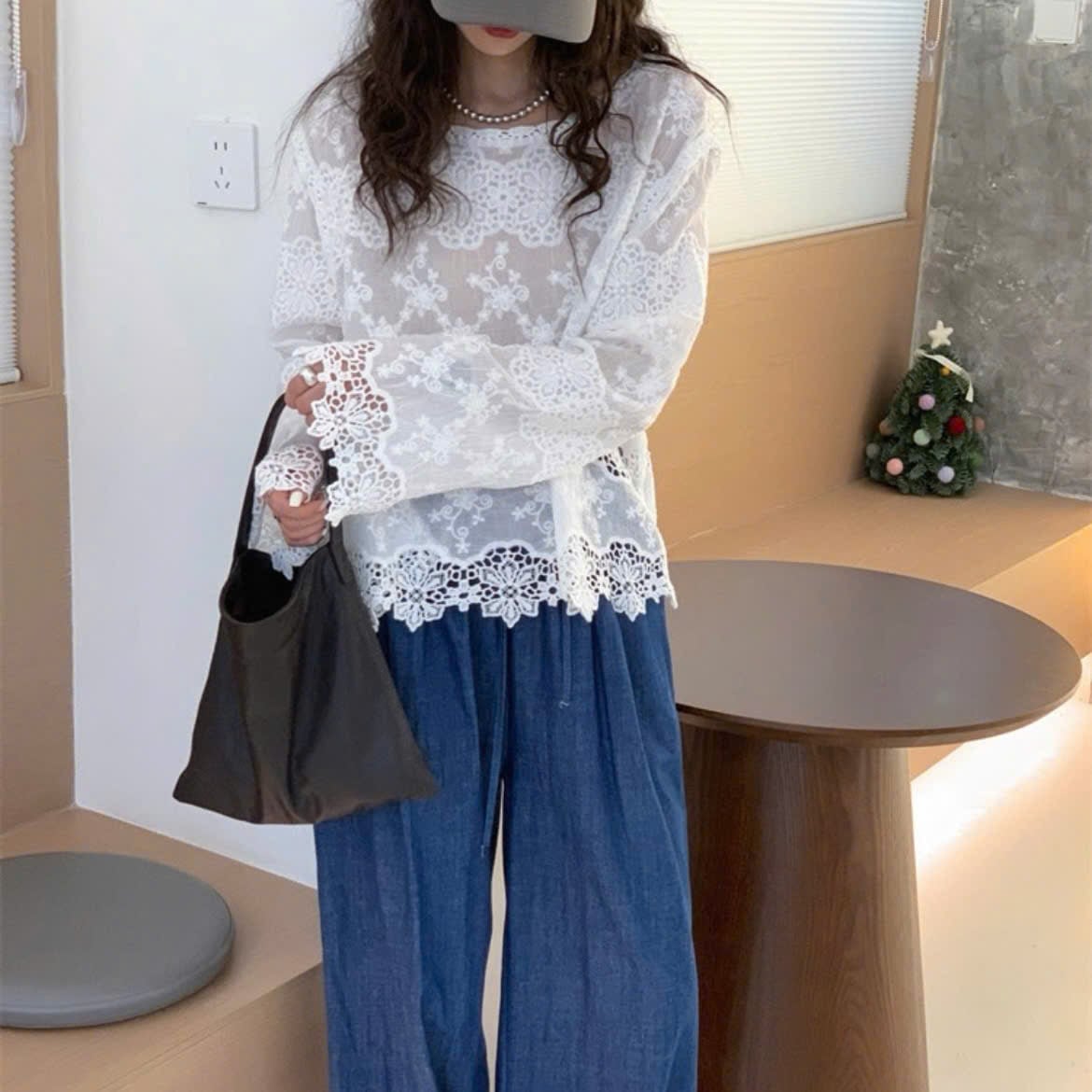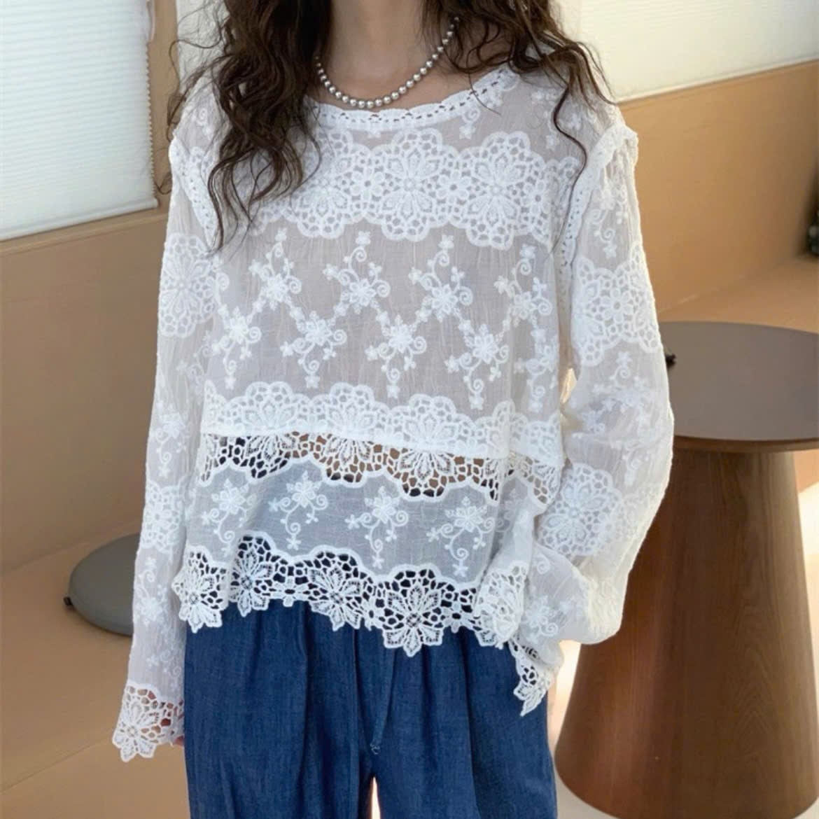繊細なレースを贅沢に使用した、長袖クロップド丈のプルオーバーブラウスです。