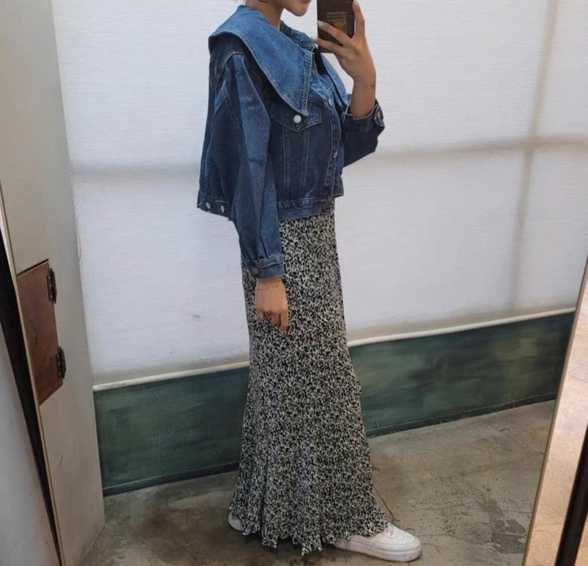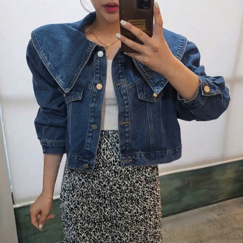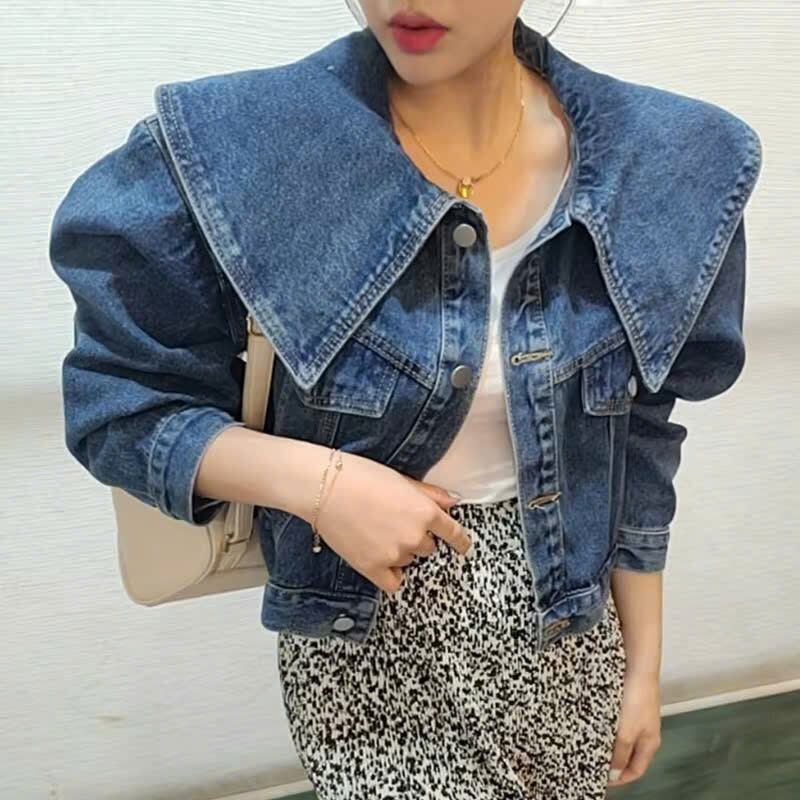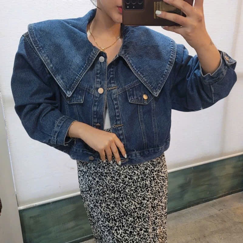 目を引く大きめの襟が特徴的なデニムジャケットです。