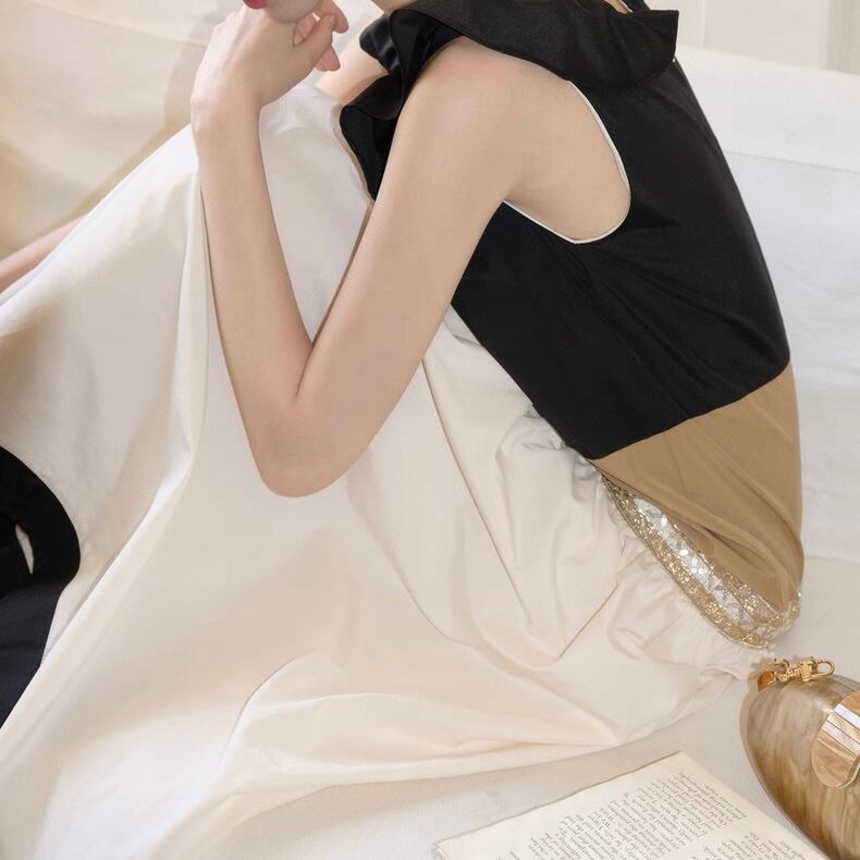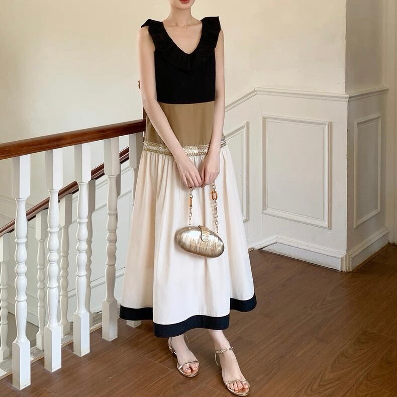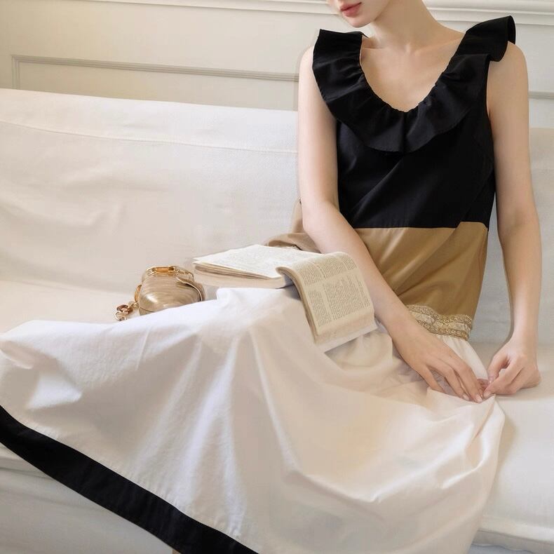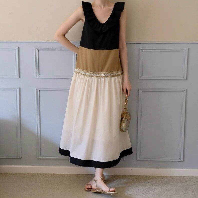 Frill-Trimmed Bicolor Midi Sleeveless Dress