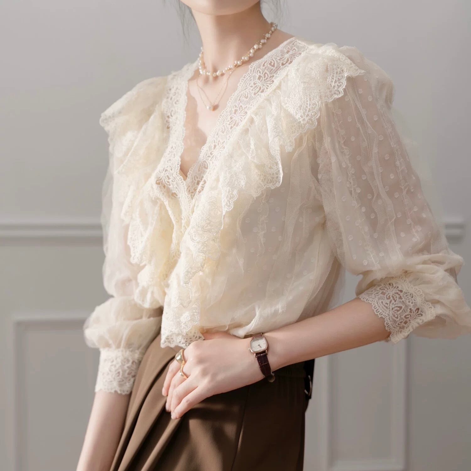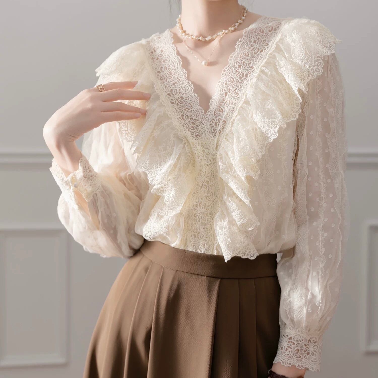 繊細なレースとフリルが上品な印象の長袖ブラウスです。Vネックのデザインがデコルテを美しく見せ、顔周りを華やかに演出します。オフィスやお出かけなど、様々なシーンで活躍するでしょう。