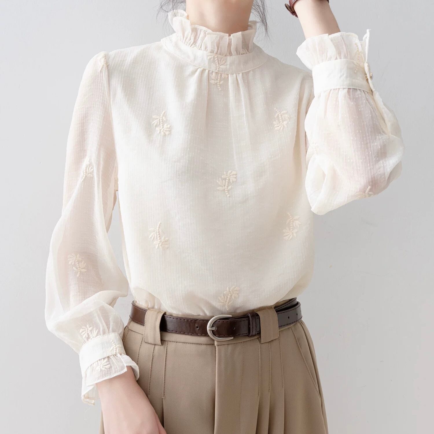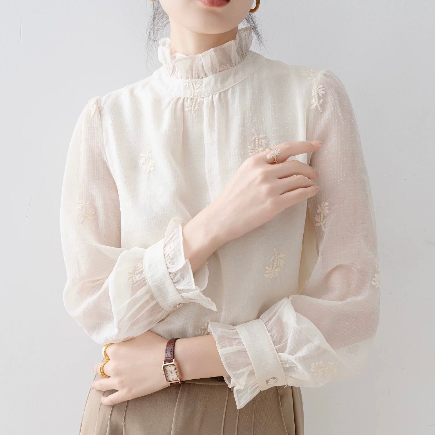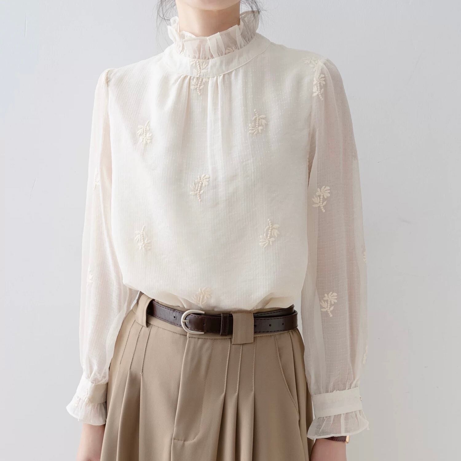 フリルネックが上品な印象を与える長袖ブラウスです。
