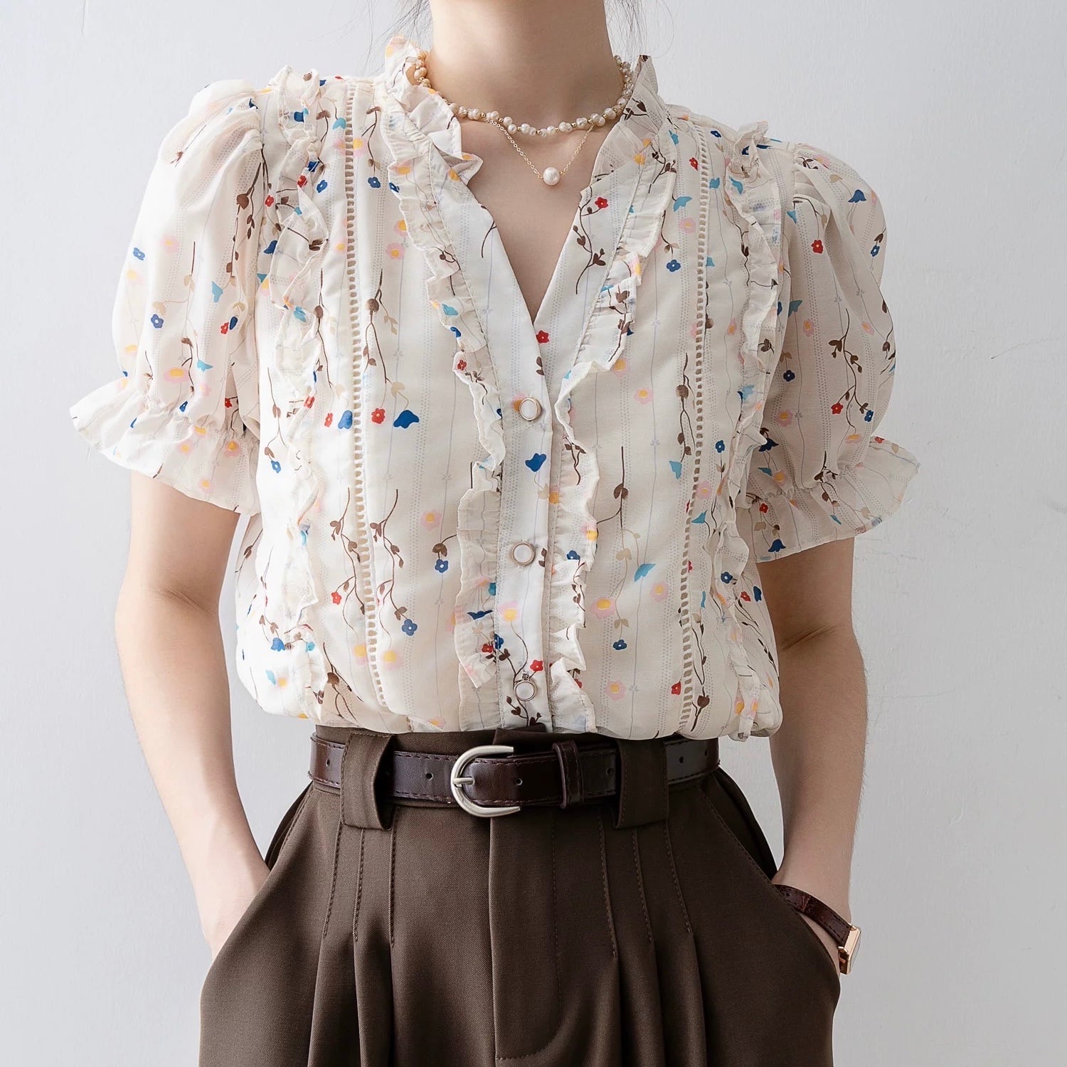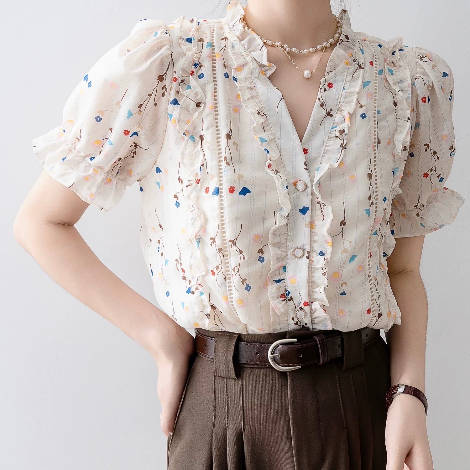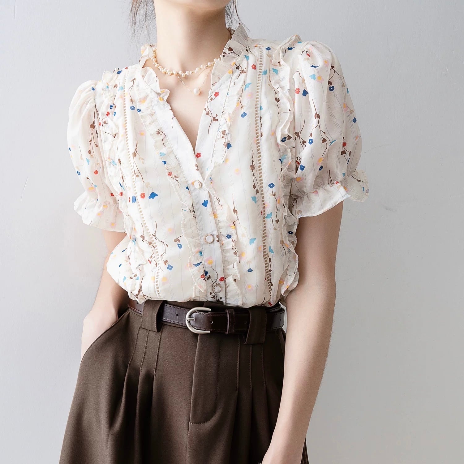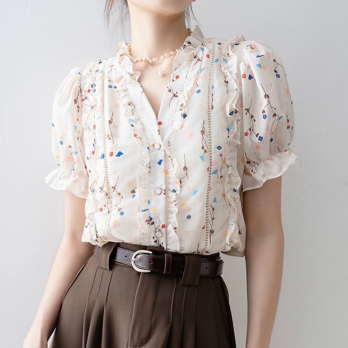 フリルがあしらわれたフェミニンな印象のブラウスです。
