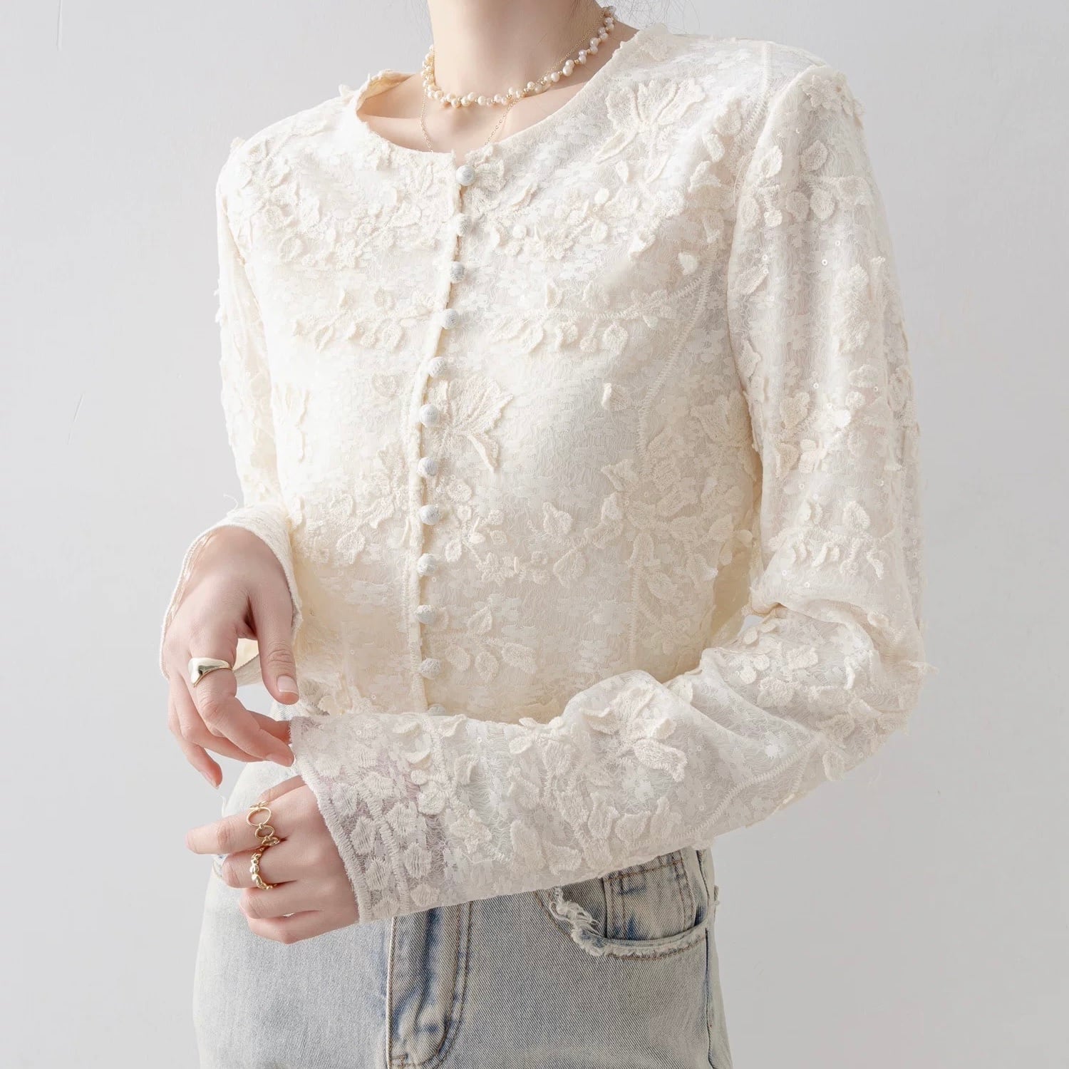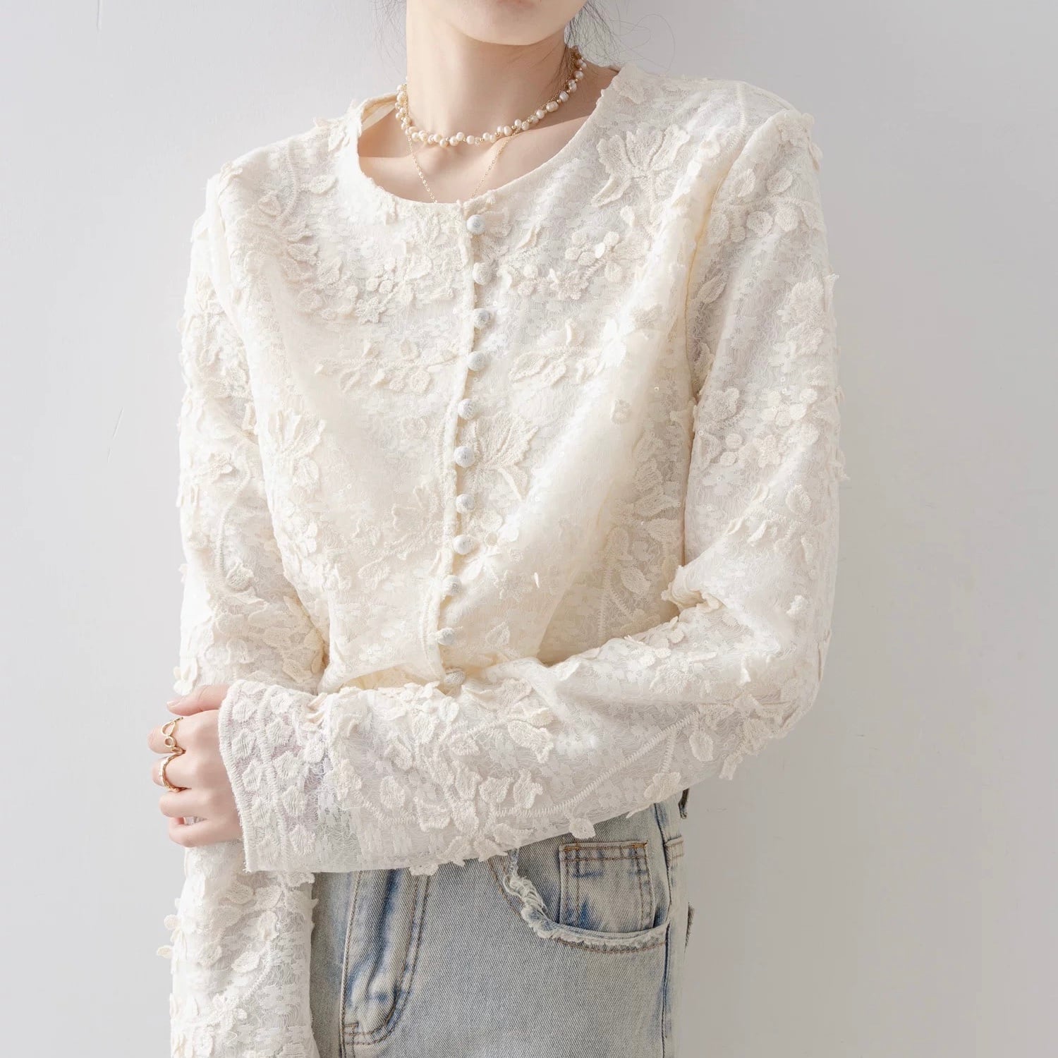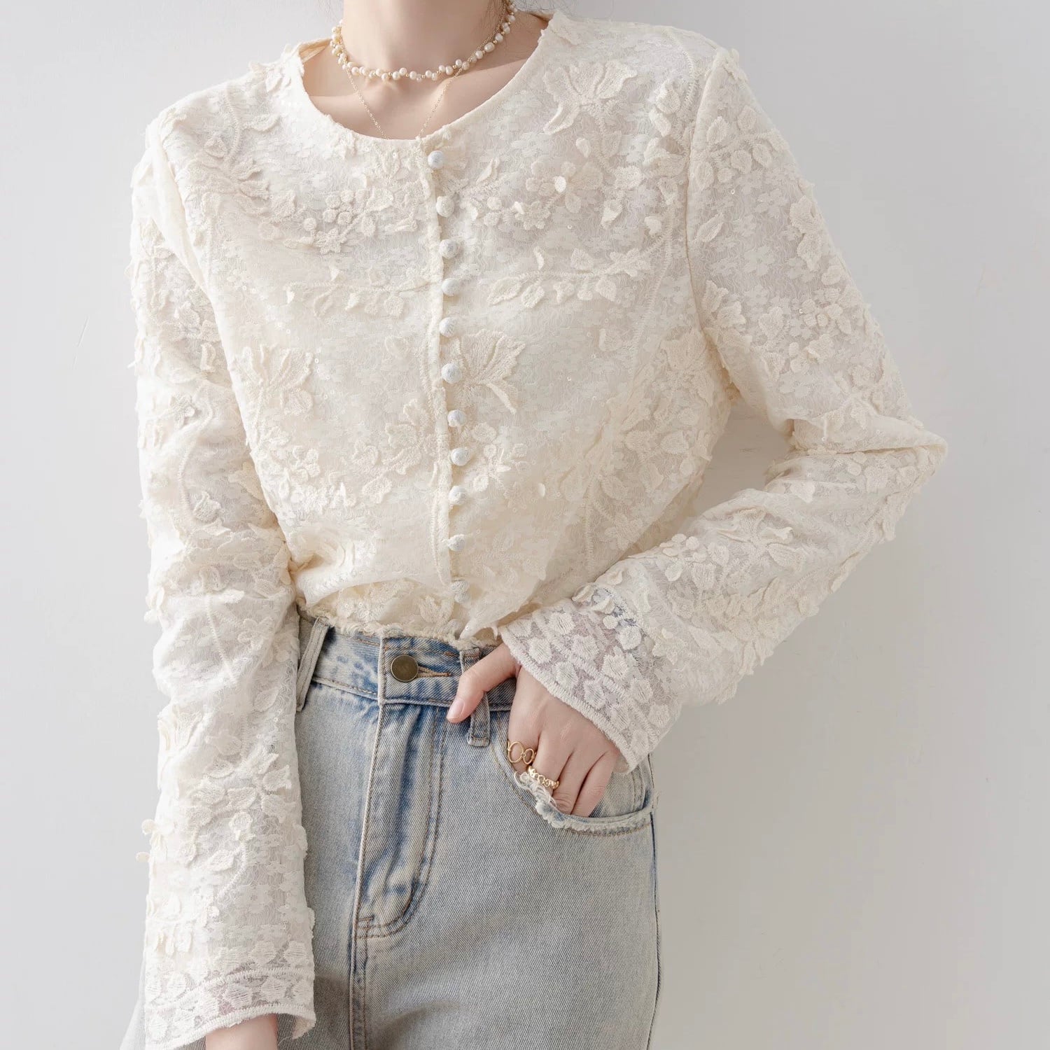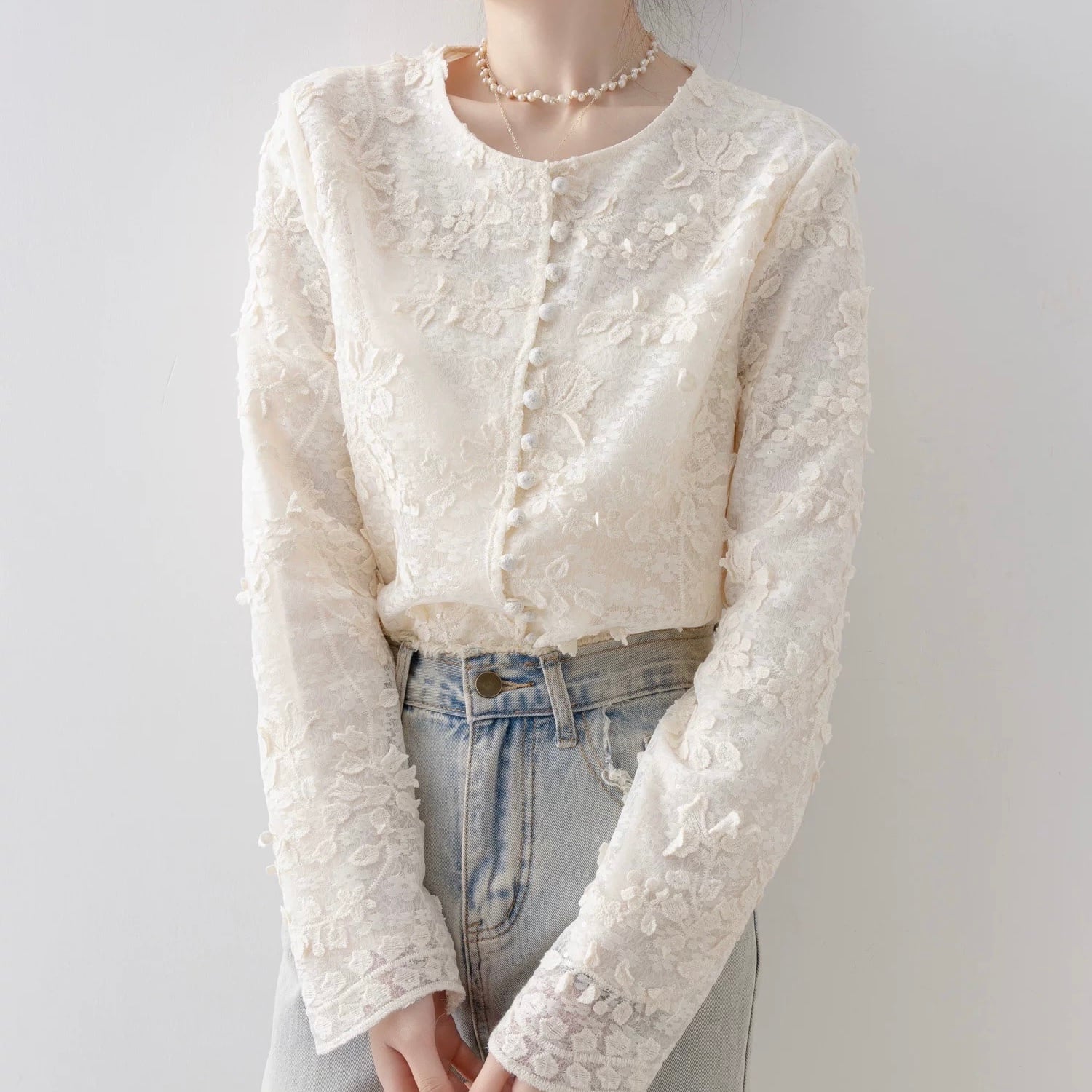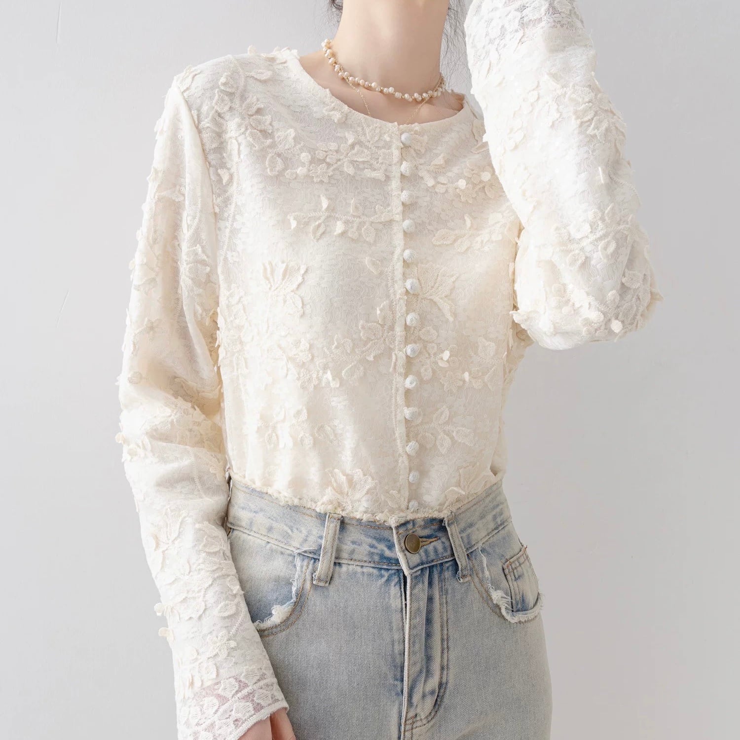 Button Front Long Sleeve Cropped Lace Shirt