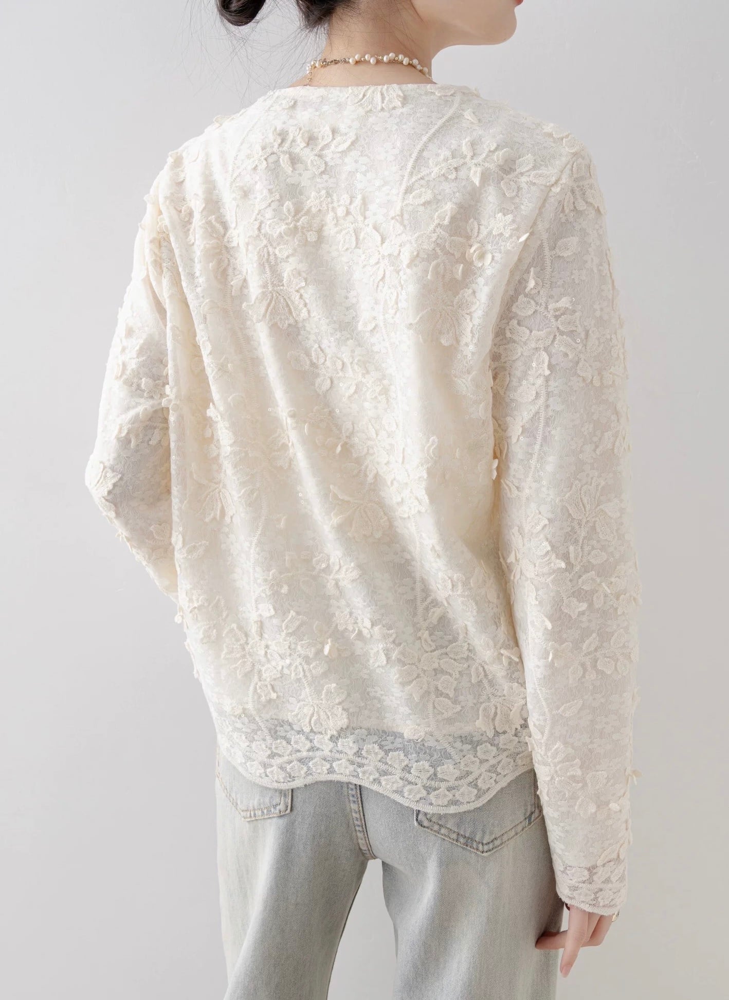 繊細なレースが上品な印象の長袖トップス。