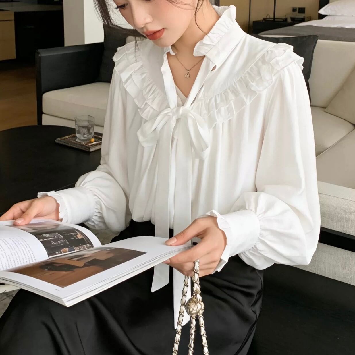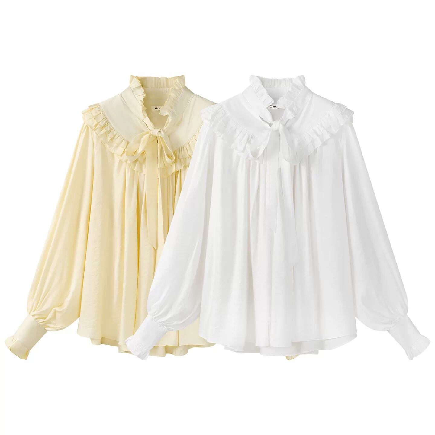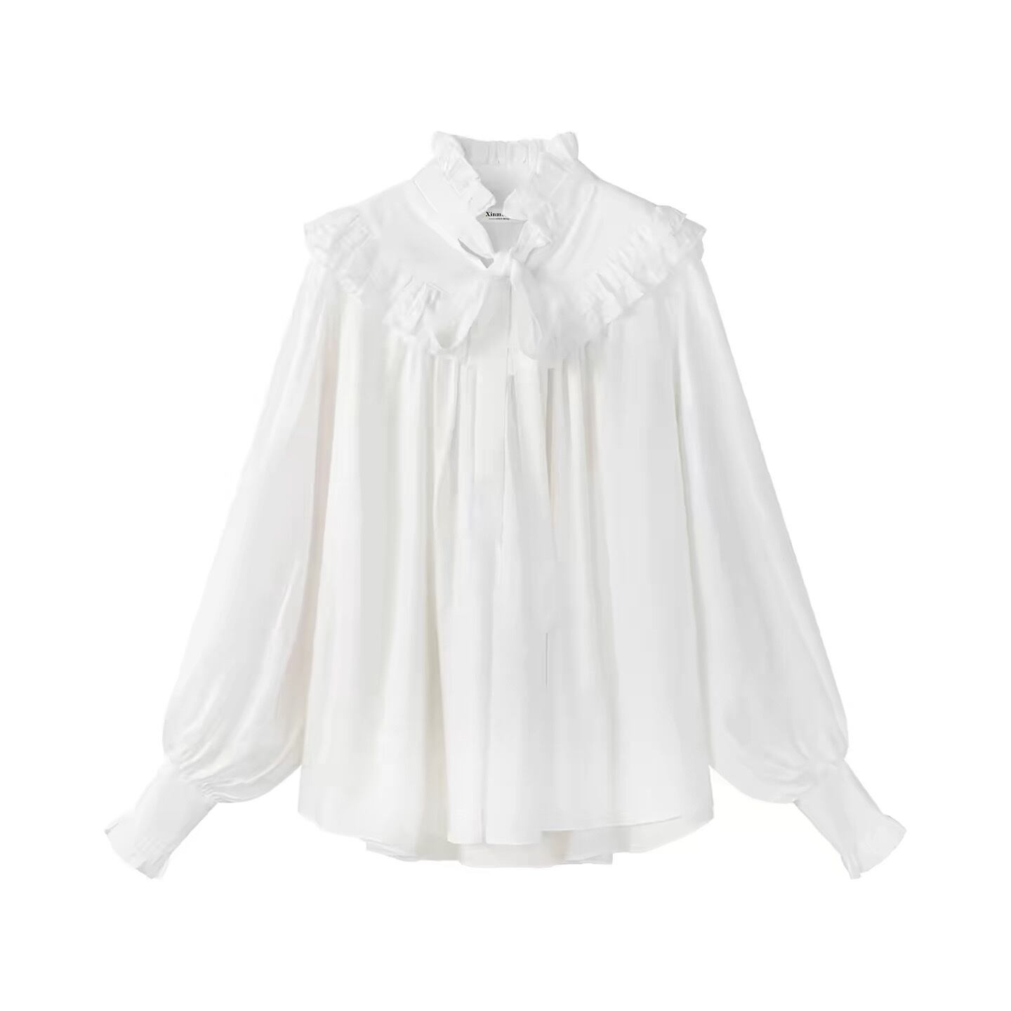 首元のフリルとリボンタイが、上品で優しい印象を与えるブラウスです。