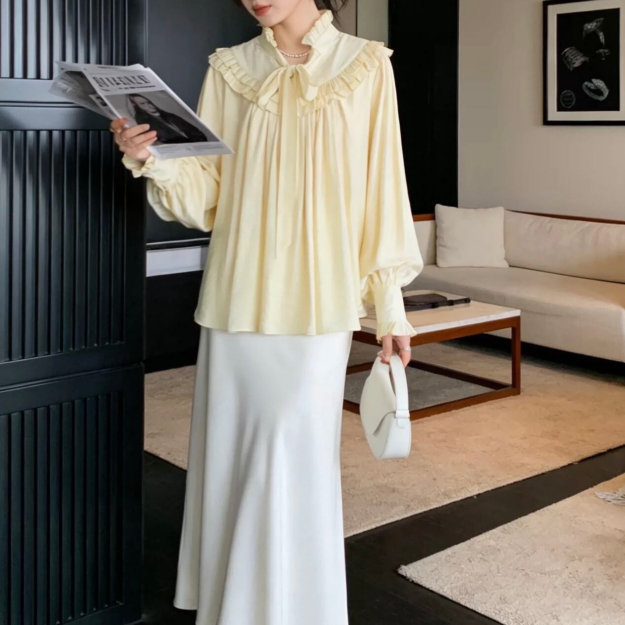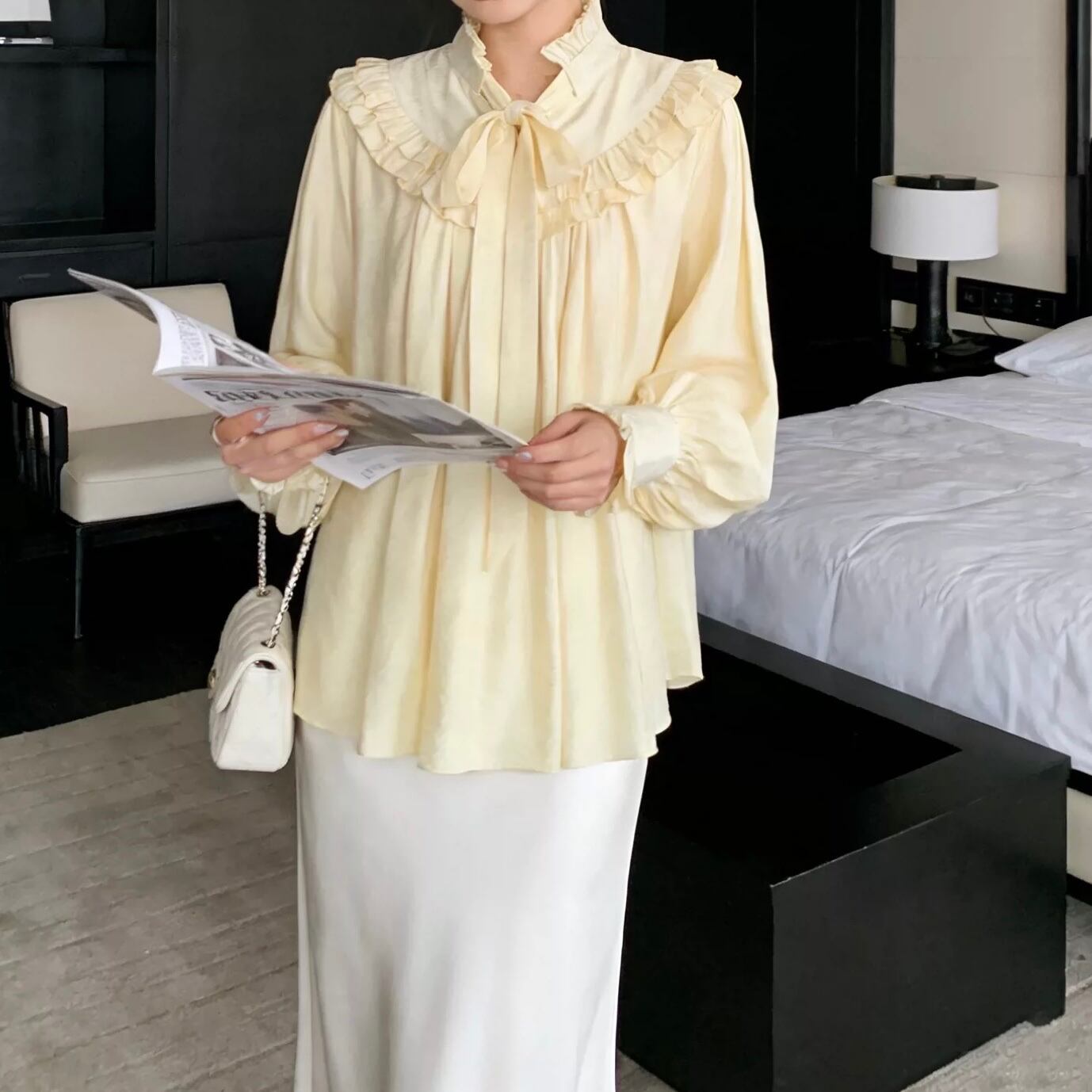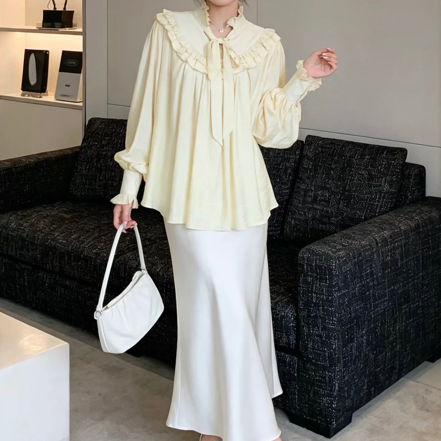 首元のフリルとリボンタイが、上品で優しい印象を与えるブラウスです。