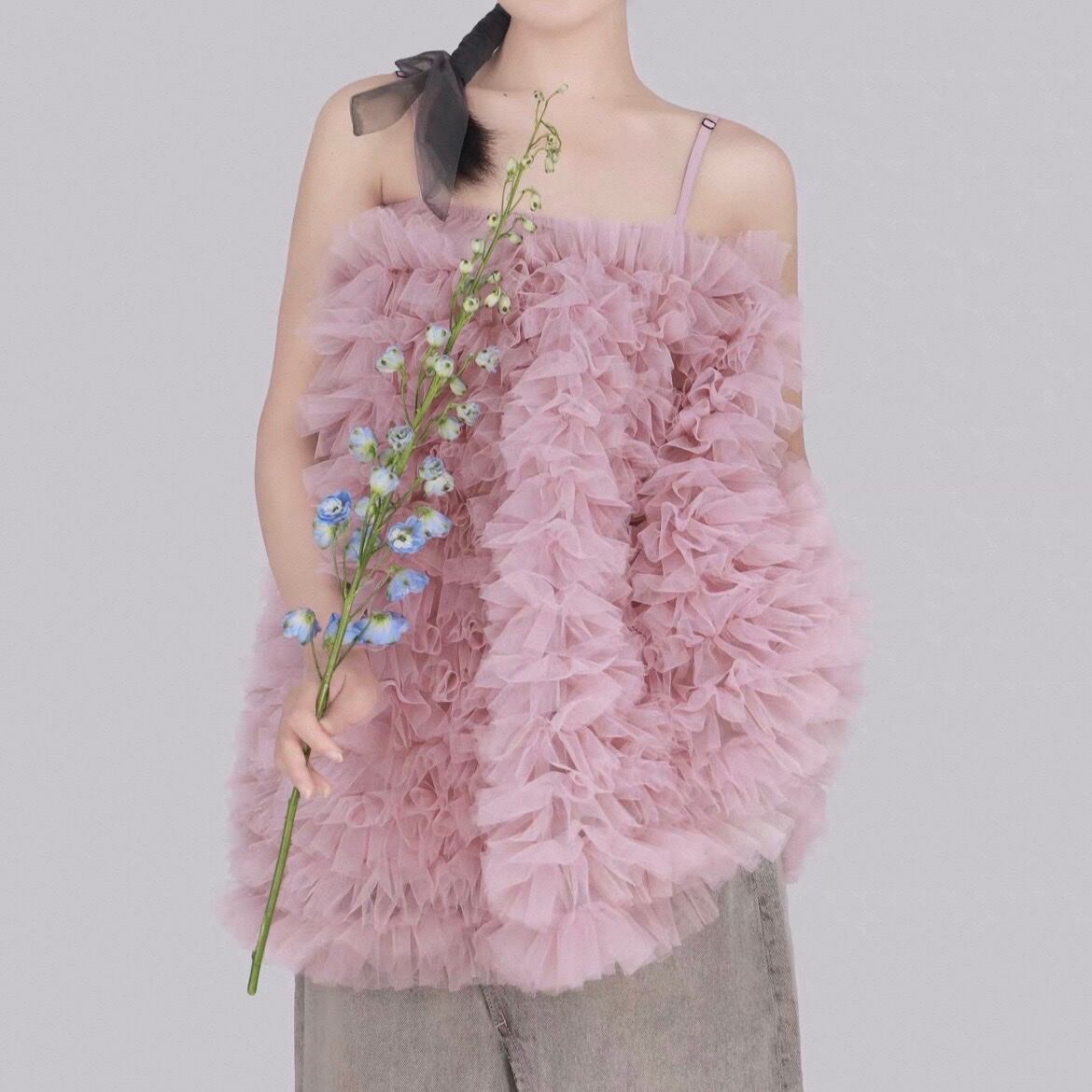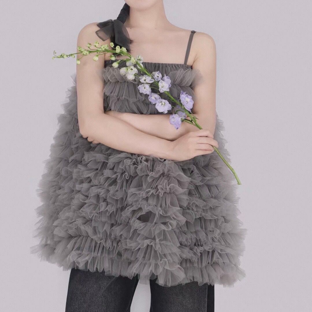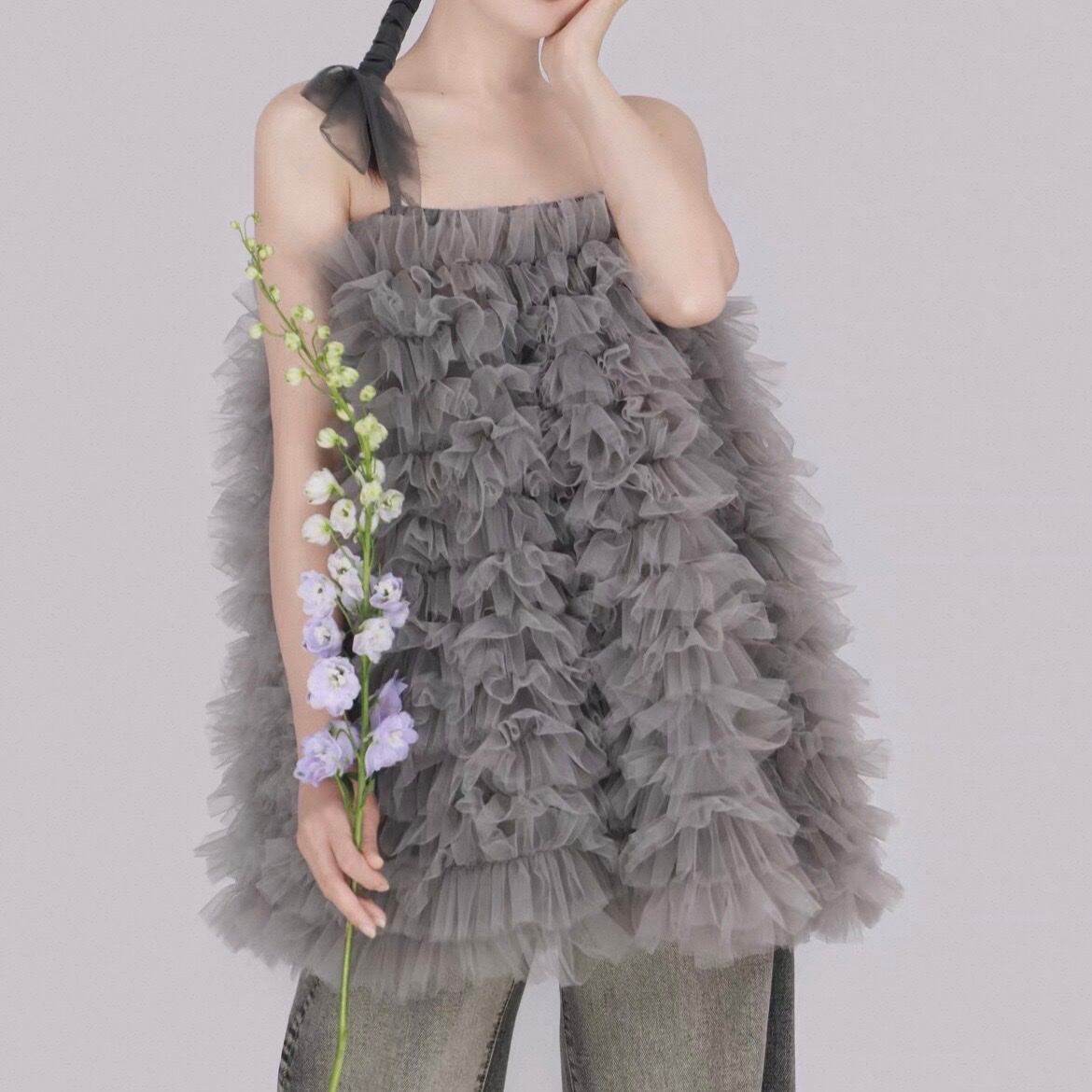 目を引くフリルのデザインが特徴的なノースリーブチュニックトップです。