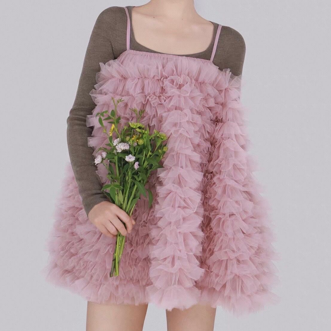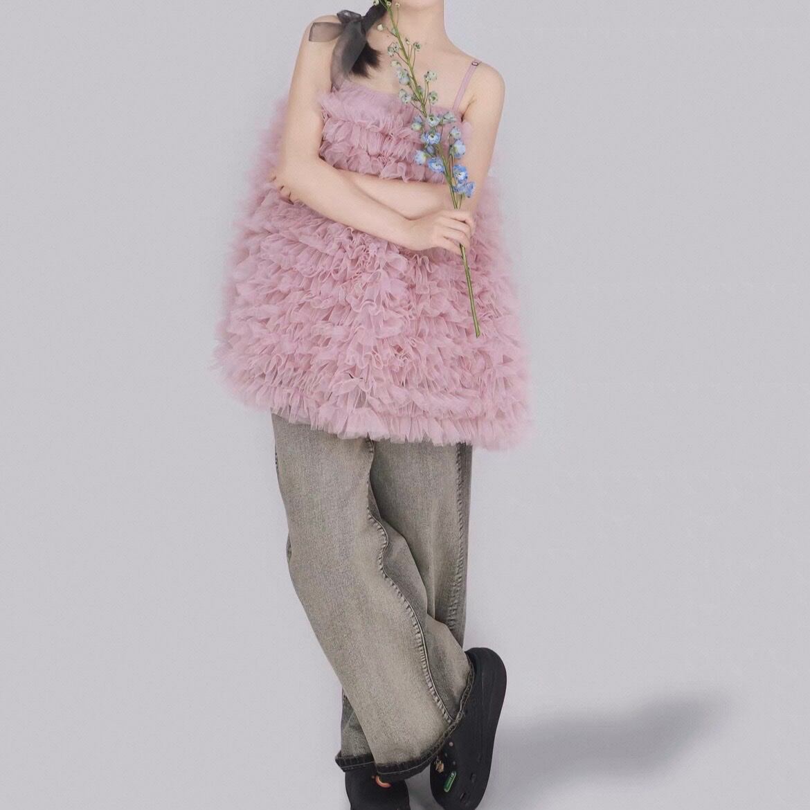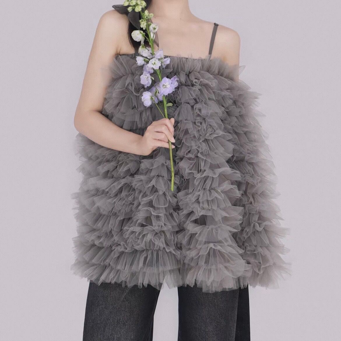 目を引くフリルのデザインが特徴的なノースリーブチュニックトップです。