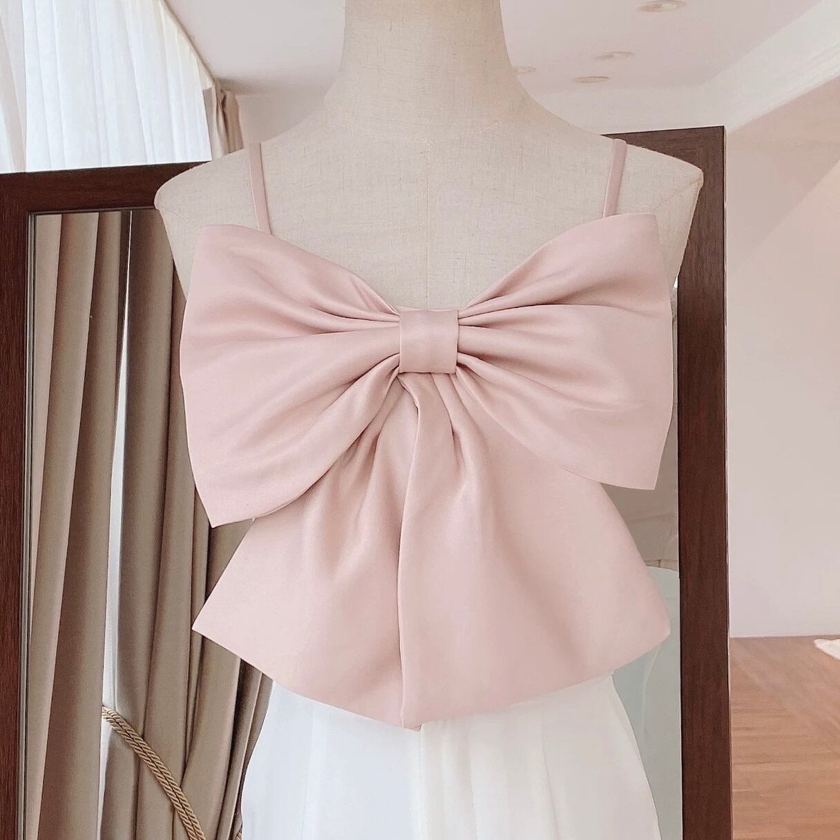 大きなリボンが目を引くノースリーブのクロップド丈トップスです。