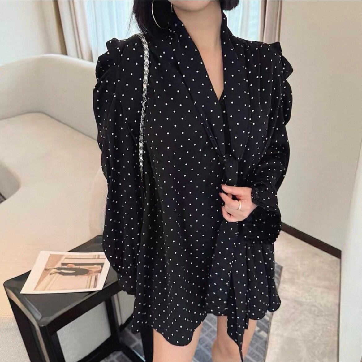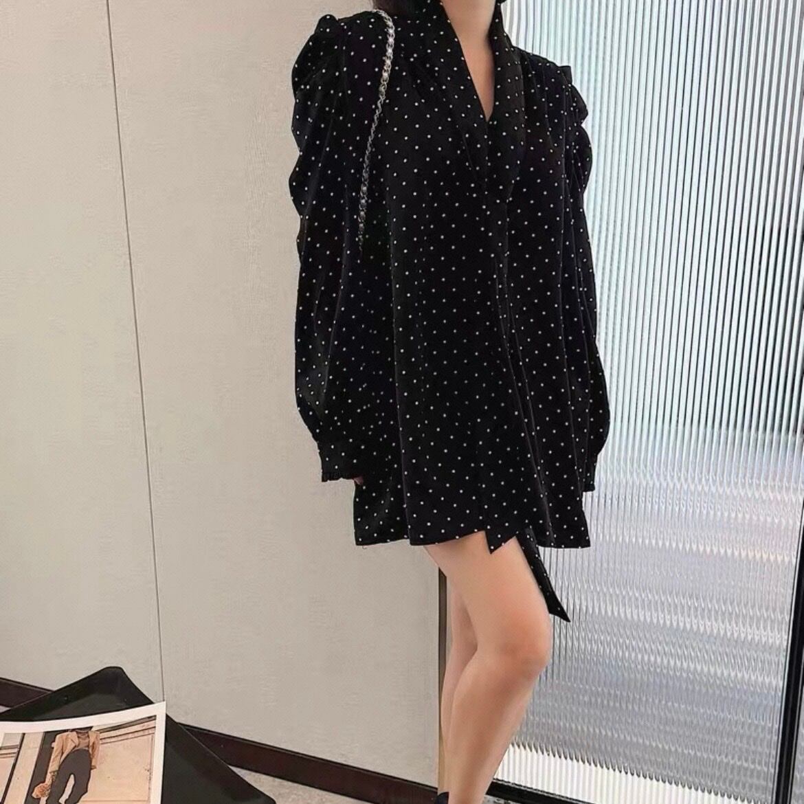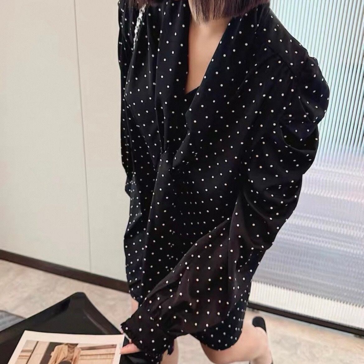 Open Collar Long Sleeve Dot Pattern Mini Dress