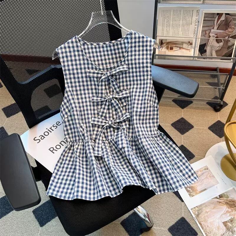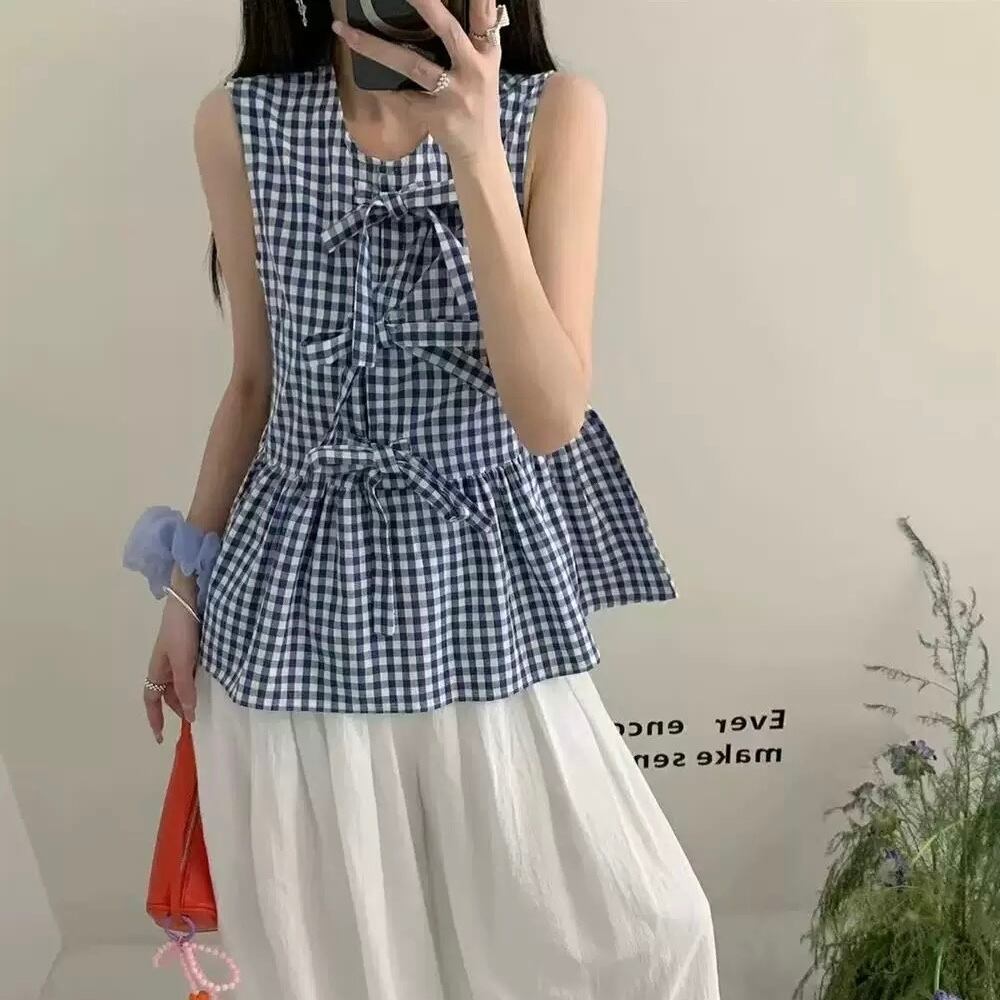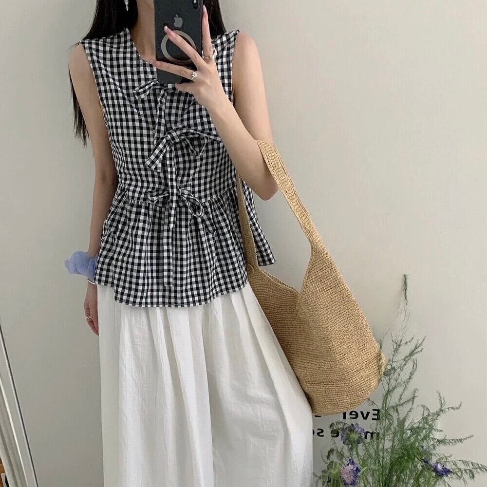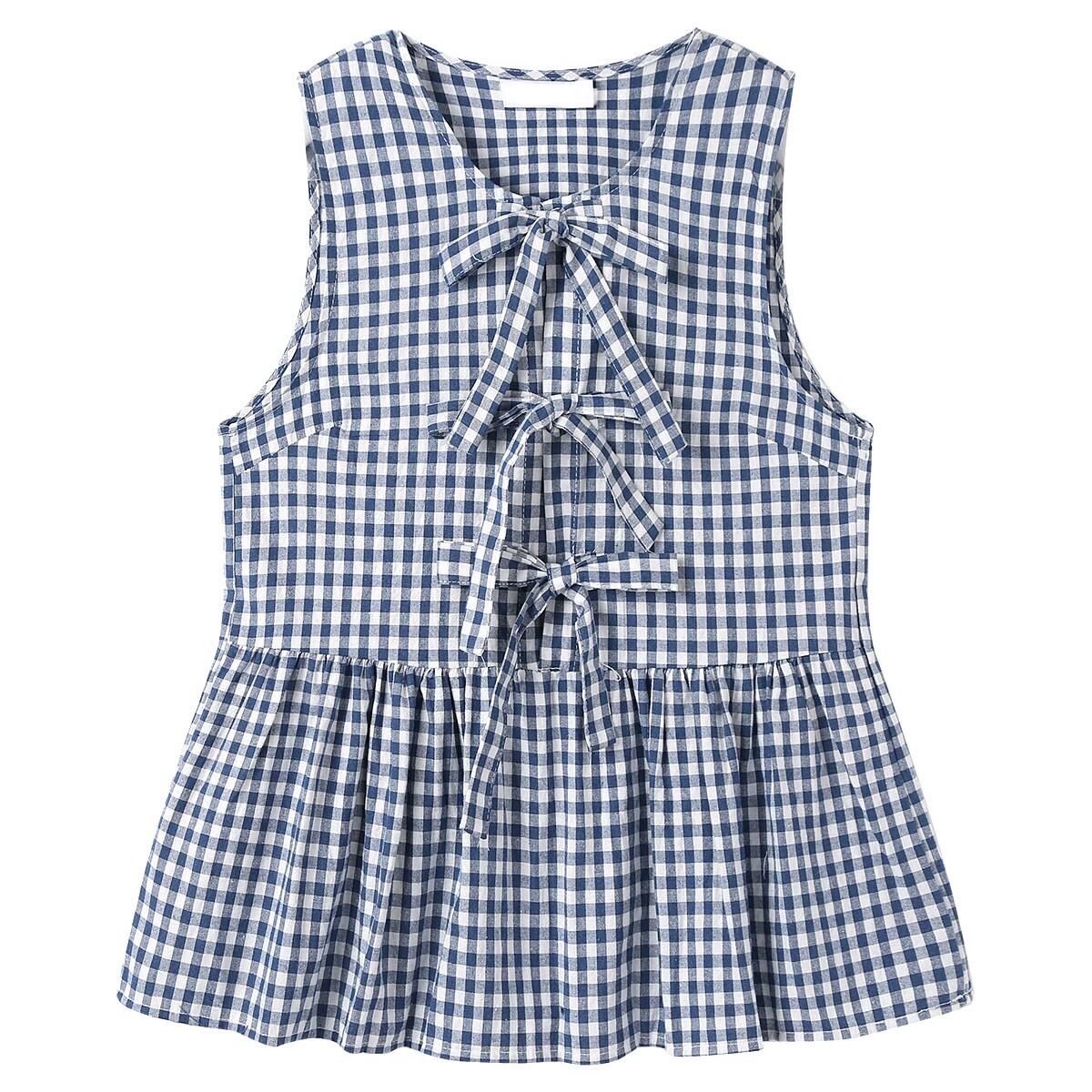 Ribbon-Style Gingham Check Flare Hem Sleeveless Tunic