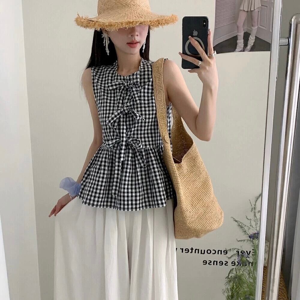 目を引くギンガムチェック柄のノースリーブチュニックです。