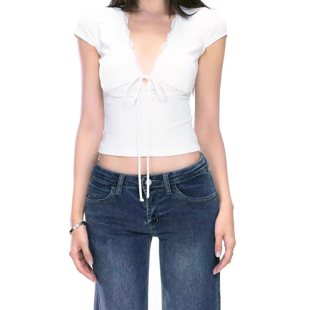 レースのトリムが施されたカットソー。