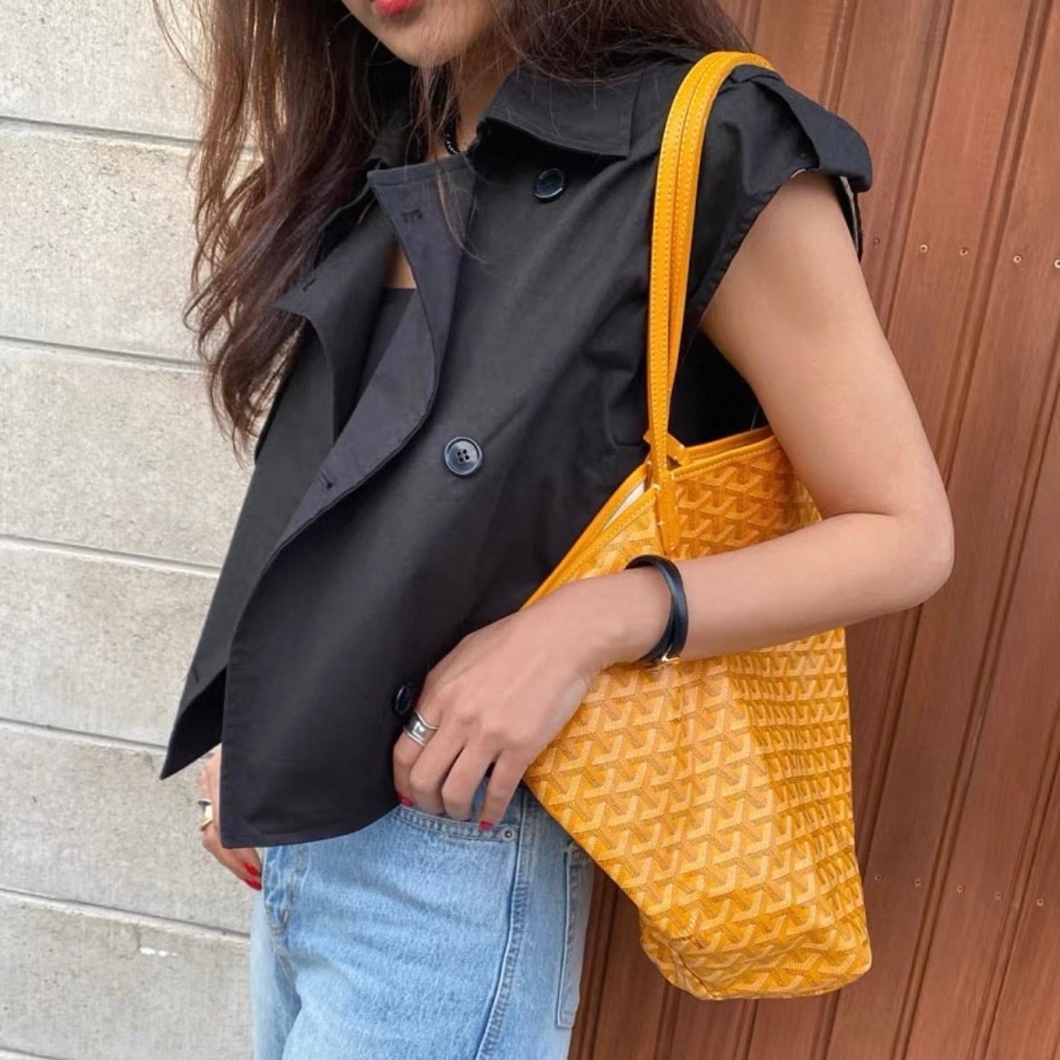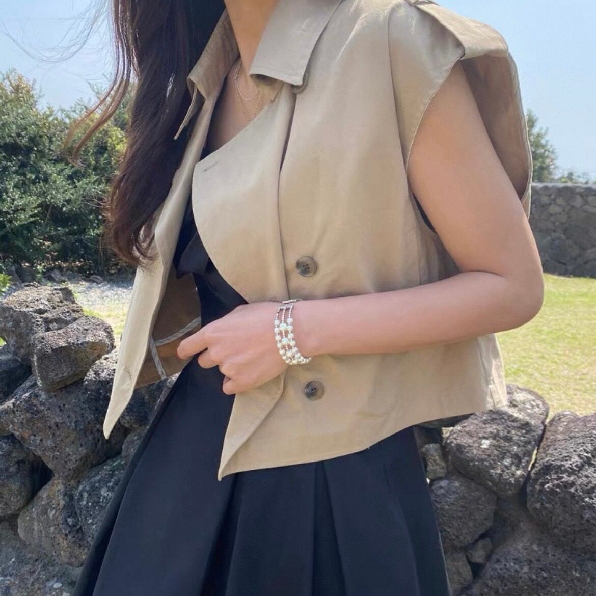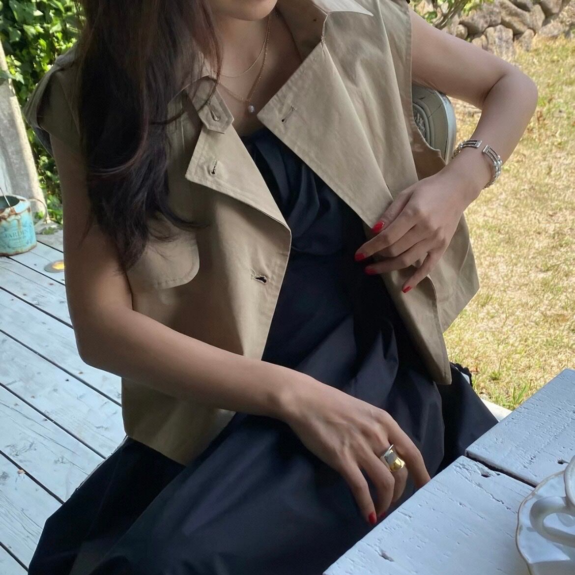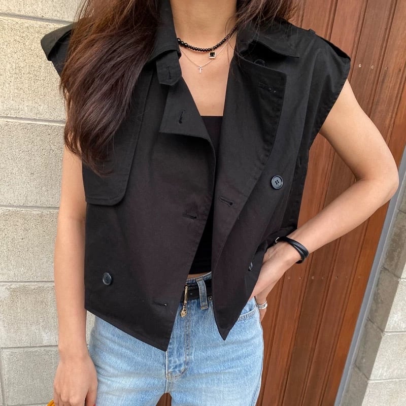 クロップド丈のノースリーブジャケットは、スタイルアップ効果も期待できます。